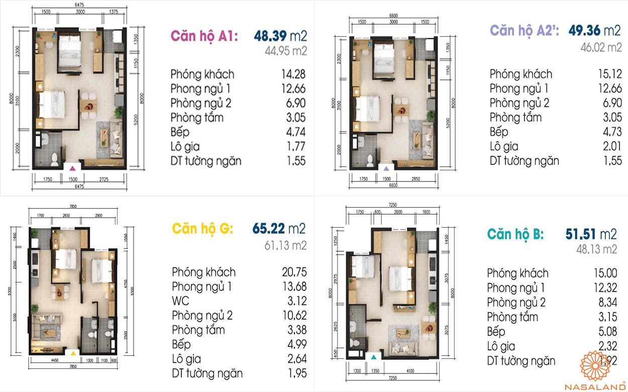 - Diện tích trung bình: 46 m2 – 74.24 m2 được bố trí từ 2 – 3 phòng ngủ.