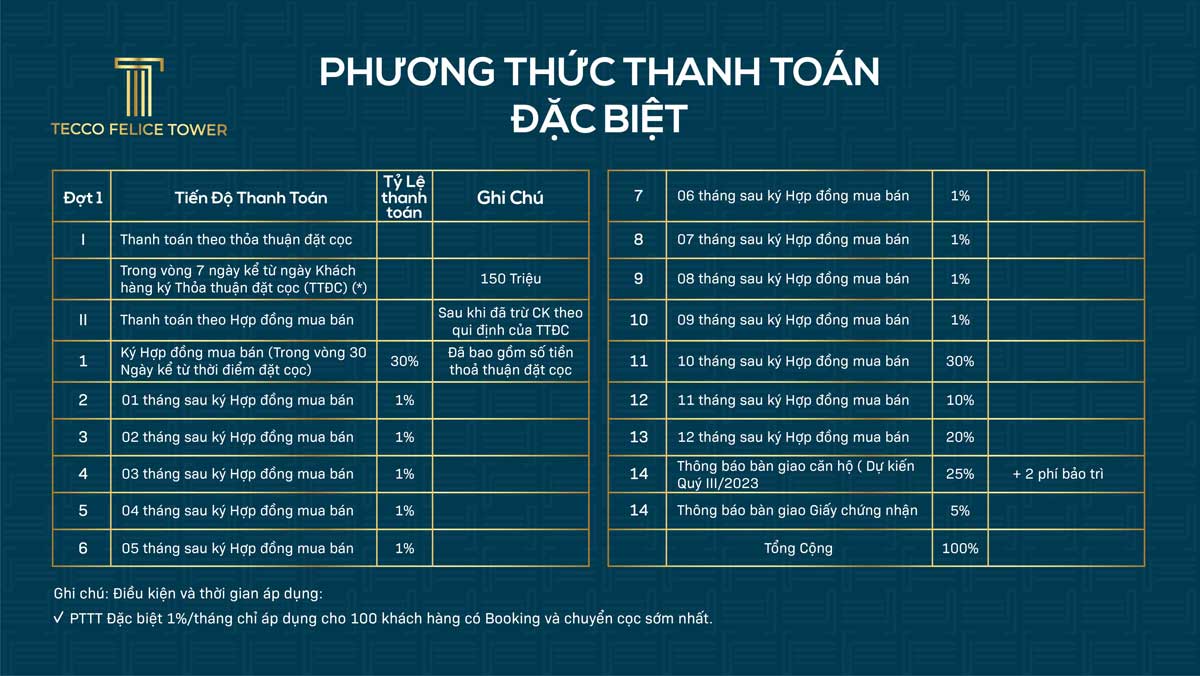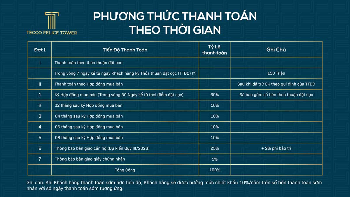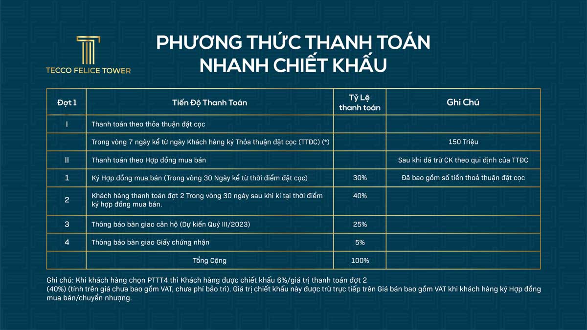 Lịch thanh toán dự án Tecco Felice Tower ưu đãi chỉ thanh toán 30% đến nhận nhà. Chiết khấu cao cho khách hàng cũ Tecco, khách hàng cũ Đất Xanh, chiết khấu mua sỉ, khách hàng địa phương và người lao động địa phương… Chi tiết các chương trình ưu đãi chiết khấu xin vui lòng liên hệ hotline nhận tư vấn chiết khấu.