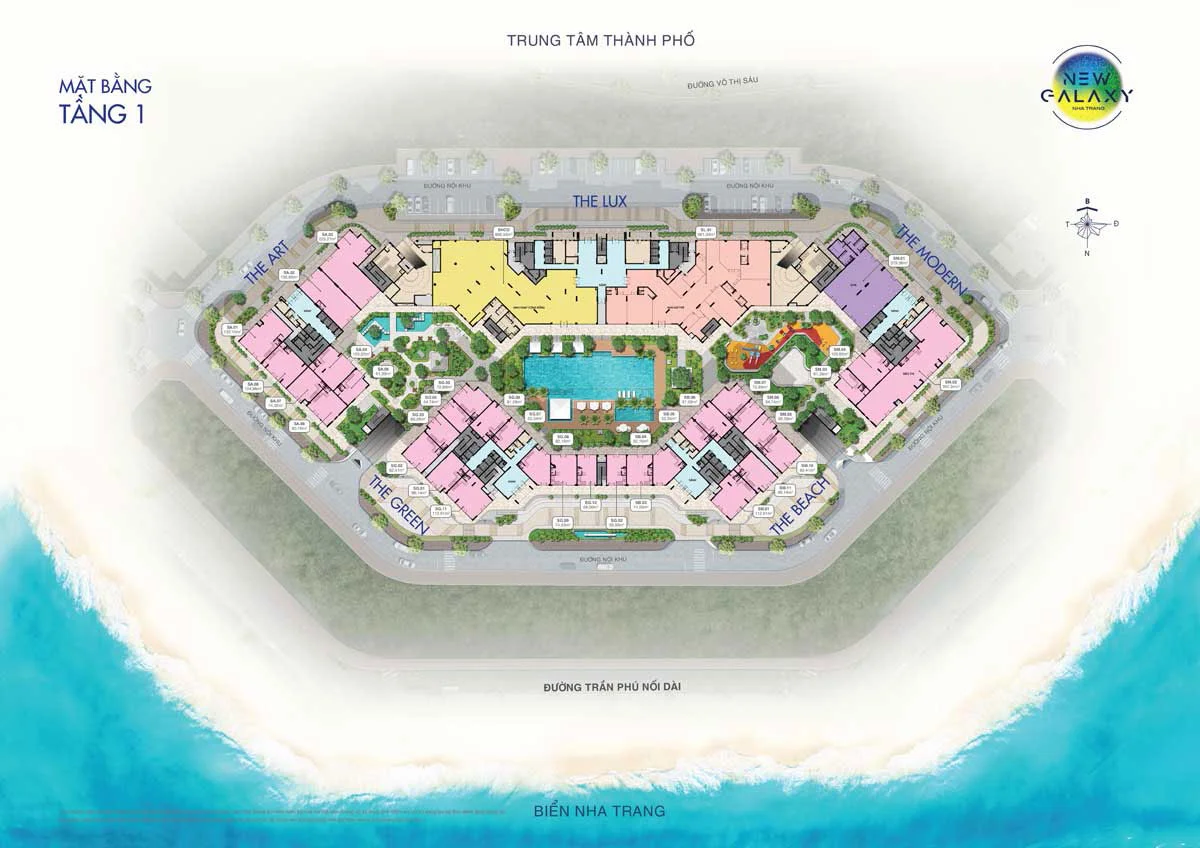Dự án New Galaxy Nha Trang được thiết kế 5 tháp đơn nguyên cao 20 tầng; bố trí thông minh đảm bảo tất cả các tháp đều không bị che chắn; các tháp có tầm view vô cực về núi Cảnh Long hay biển Nha Trang. Tiện ích nội khu đa phần được bố trí tại tầng trệt, trung tâm của 5 tháp. Mật độ xây dụng khối đế tháp, mảng xanh lớn giúp cảnh quan dự án xanh mát và thông thoáng.